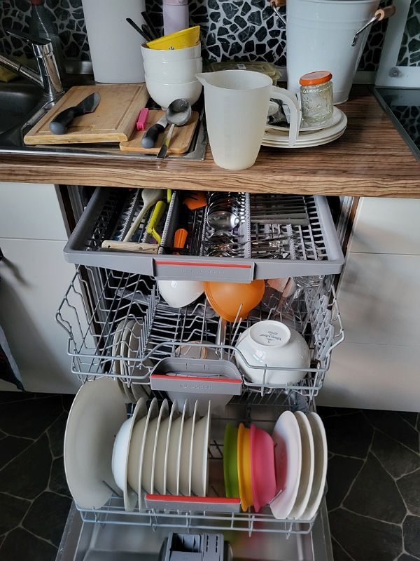 Die Spülmaschine wollte dann vor dem Abendessen auch noch ausgeräumt werden. Der Wäschekorb mit den sauberen Sachen aus dem Trockner steht noch unbeachtet im Wohnzimmer hinter der Tür.