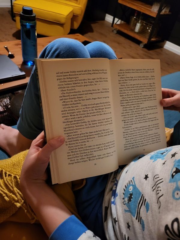 Zum Abschluss des Tages lesen mein Sohn und ich noch im zweiten Harry Potter Buch „Die Kammer des Schreckens“ weiter. Wir haben am Wochenende den ersten Film geschaut und Teil zwei sieht er erst, wenn das Buch gelesen wurde.